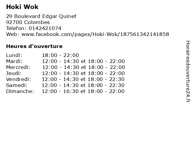 | Mercredi | 12:00-14:30 et 18:00-22:00 |
