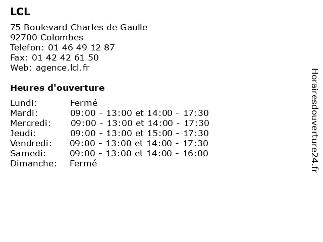 1 LCL (Distance: 0,83 km) 100 Boulevard De La Republique, 92250 La Garenne Colombes banque, crédit, lcl, service 3 LCL (Distance: 1,74 km) 24 Avenue Léonard de Vinci, 92400 Courbevoie agence, assurance, bancaire, banque, lcl 4 LCL (Distance: 1,87 km) 8 Avenue Joseph Froment, 92250 La-Garenne-Colombes agence, assurance, bancaire, banque, lcl 5 LCL (Distance: 1,92 km) 87 Rue des Trois Fontanot, 92000 Nanterre agence, assurance, bancaire, banque, lcl 6 LCL (Distance: 2,36 km) 15 Parvis de la Défense, 92092 Paris La Défense centre, commercial, defense, la, lcl, les, paris, temps |