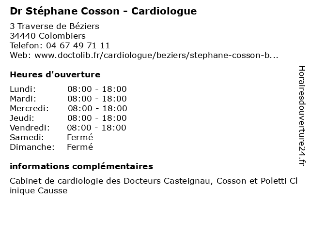 1 Dr Stéphane Cosson - Cardiologue (Distance: 0,11 km) 3 Traverse de Béziers, 34440 Colombiers autre, cardiologie, cardiologue, consultation, cosson, docteur, dr, medecins, santé, stéphane 2 Dr Gaelle Casteignau - Cardiologue (Distance: 0,00 km) 3 Traverse de Béziers, 34440 Colombiers cardiologue, casteignau, consultation, docteur, dr, gaelle, med, médecin, médecine, secrétariat, traitement 3 Dr Matthieu Rola - Cardiologue (Distance: 0,01 km) 3 Traverse de Béziers, 34440 Colombiers cardio, cardiologie, cardiologue, coeur, dr, matthieu, rola 4 Dr Jessica Labour - Cardiologue (Distance: 0,01 km) 3 Traverse de Béziers, 34440 Colombiers cardio, cardiologie, cardiologue, coeur, dr, jessica, labour 5 Dr.Cosson Stephane (Horaires du secrétariat)- Cardiologie (Distance: 1,03 km) . Traverse de Béziers, 34400 Colombiers cardiologie, docteur, dr.cosson, du, horaires, medecins, sante, secrétariat, stephane 6 Dr Stéphane Cosson - Cardiologue - secrétariat (Distance: 8,07 km) 7 Rue Joseph Fabre, 34500 Béziers cardiologue, consultation, cosson, docteur, dr, med, médecin, médecine, secrétariat, stéphane, traitement |