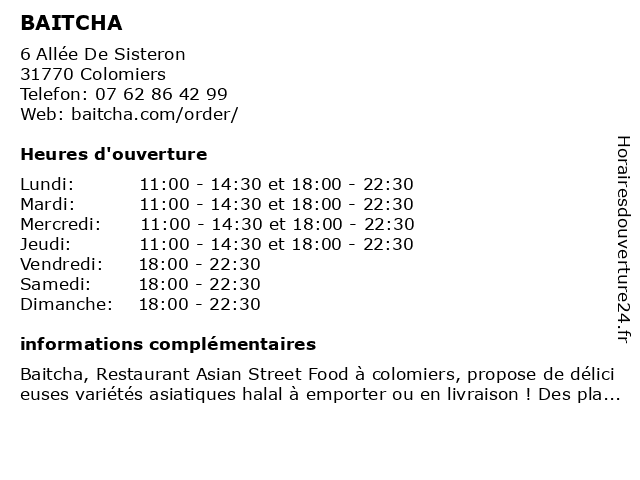 | Mardi | 11:00-14:30 et 18:00-22:30 |