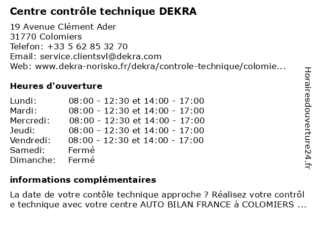 Description de l'entreprise :Préparer votre contrôle techniquePour préparer votre contrôle technique dans notre centre DEKRA de Colomiers, vous pouvez vérifier en amont différents points comme les pneumatiques, la visibilité, le niveau d'huile ou encore l'habitacle. Pour tout savoir, consultez notre vidéo. Voir l'offre |