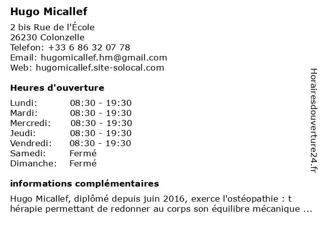 2 Hugo Messana - Ostéopathe (Distance: 22,10 km) 5 Montée Saint-Martin, 26200 Montélimar hugo, messana, osteo, osteopathe, ostéopathe, sante, soins 3 Restaurant Le Victor Hugo (Distance: 44,98 km) 9 Place Victor Hugo, 07000 Privas bar, bistro, bistrot, brasserie, café, hugo, le, restaurant, restauration, victor 4 Centre Hospitalier Site Bernard Hugo (Aubenas) (Distance: 46,63 km) . Avenue de Bellande, 07205 Aubenas aubenas, bernard, centre, docteur, hospitalier, hugo, medecins, sante, site 5 HUGO BOSS Shop (Centre Commercial Cap Sud) (Distance: 51,44 km) , Avenue de la Croix Rouge, 84000 Avignon accessoires, bags, boss, cap, centre, commercial, hugo, menswear, perfumes, shoes, shop, sud, watches, womenswear 6 HUGO BOSS Shop (Distance: 51,97 km) 162, Avenue Pierre Sémard, 84000 Avignon accessoires, bags, boss, hugo, menswear, perfumes, shoes, shop, watches, womenswear |