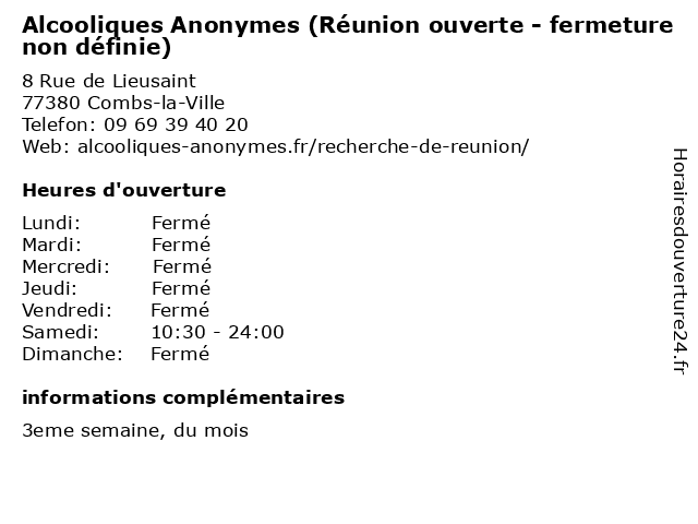 Termes de recherche pour Alcooliques Anonymes (Réunion ouverte - fermeture non définie):reunion, non, fermeture, ouverte, alcooliques, anonymes, définie |
