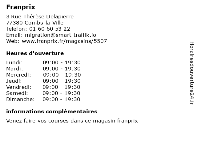 1 Franprix (Distance: 1,64 km) 6 Rue de Boissy-Saint-Léger, 91480 Quincy-sous-Sénart bibi, carte de fidélité, courses, franprix, magasin, produits frais, programme de fidélité, supermarché, épicerie 2 Franprix (Distance: 3,64 km) 23 Place du Colombier, 77127 Lieusaint alimentation, franprix, fruits, legumes, superettes 3 Franprix (Distance: 3,65 km) 23 Place du Colombier, 77127 Lieusaint bibi, carte de fidélité, courses, franprix, magasin, produits frais, programme de fidélité, supermarché, épicerie 4 Franprix (Distance: 3,76 km) - Centre, 77550 MOISSY CRAMAYEL alimentation générale, entretien de la maison et de l'hygiène, franprix, franprix magasin, fruits et légumes frais 5 Franprix (Distance: 4,26 km) 1 Avenue Victor Hugo, 91860 Épinay-sous-Sénart bibi, carte de fidélité, courses, franprix, magasin, produits frais, programme de fidélité, supermarché, épicerie 6 Franprix (Distance: 5,63 km) 46 Rue de Montgeron, 91800 Brunoy bibi, carte de fidélité, courses, franprix, magasin, produits frais, programme de fidélité, supermarché, épicerie |