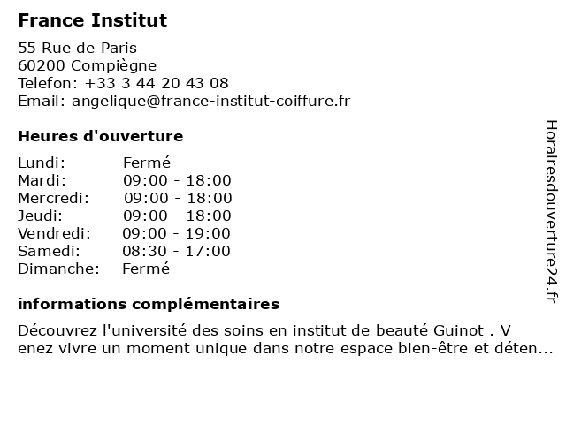 1 Institut L’Onglerie (Distance: 0,34 km) 7 Rue du Change, 60200 Compiègne beauté, institut, l’onglerie, relax, spa, épilation 2 Institut de beauté Compiègne Bodyminute (Distance: 0,36 km) 13 Rue du Change, 60200 Compiègne beauté, bodyminute, compiègne, de, institut 3 Institut Santé Form (Distance: 0,50 km) 2A Impasse Laville, 60200 Compiègne beauté, de, form, institut, instituts, santeform, santé 4 Institut Natur'Elle (Distance: 1,19 km) 128 Avenue Octave Butin, 60280 Margny-lès-Compiègne beauté, institut, manucure, natur'elle, onglerie, soins, épilation 5 Institut Fée Moi Belle (Distance: 12,66 km) 302 rue de Paris, 60170 Ribécourt-Dreslincour beauté soins, belle, fée, institut, manucure, massage, moi, épilation 6 Picard (Contactez notre Service) (Distance: 0,13 km) 7 Place de l'ancien hôpital, 60200 Compiegne contactez, la production française, les fruits, les légumes, notre, picard, produit développé en france, service, société française de produits surgelés, société: en cuisine, un magasin picard |