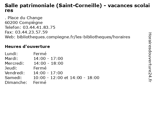 1 Bibliothèque Saint-Corneille - vacances scolaires (Distance: 0,02 km) . Place du Change, 60200 Compiègne bibliothèque, cd audio, cd.rom, corneille, livres, revues, saint, scolaires, vacances 2 Centre Régional des œuvres Universitaires et Scolaires (Distance: 1,02 km) 6 Rue Winston Churchill, 60200 Compiègne administration, assoc, centre, des, et, régional, scolaires, services, services publics, universitaires, œuvres 3 Bibliothèque Jacques-Mourichon - vacances scolaires (Distance: 1,51 km) 28 rue Koenig, 60200 Compiègne bibliothèque, cd audio, cd.rom, jacques, livres, mourichon, revues, scolaires, vacances 4 Speed Park (vacances scolaires) (Distance: 3,90 km) - Place Jacques Tati, 60880 Jaux "vacances, bar, bowling, jeux, park, scolaires, scolaires", speed, vacances 5 Le Monde de Lili - Hors vacances scolaires (Distance: 3,90 km) - Place Jacques Tati, 60880 Jaux couverts, de, enfants, hors, indoor, jeux, le, lili, l’abeille, monde, parc, scolaires, sorties, toboggan, vacances 6 Le Monde de Lili - Vacances scolaires (Distance: 3,90 km) - Place Jacques Tati, 60880 Jaux couverts, de, enfants, et, fériés, indoor, jeux, jours, le, lili, l’abeille, monde, parc, scolaires, sorties, toboggan, vacances |