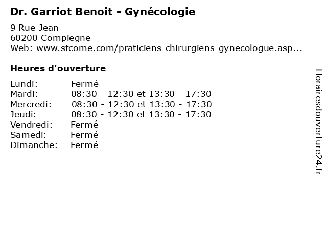 1 Dr. Geraud Marc - Gynécologie (Distance: 0,00 km) 9 Rue Jean, 60200 Compiegne docteur, dr., geraud, gynécologie, marc, medecins, sante 2 Dr. Jacky Garriot - Gynécologie (Horaires de consultation sur rendez-vous) (Distance: 0,03 km) 7 Rue Jean, 60200 Compiegne consultation, de, docteur, dr., garriot, gynécologie, horaires, jacky, medecins, rendez, santé, sur, vous 3 Dr. Jacky Garriot - Gynécologie (Horaires de consultation sur rendez-vous une semaine sur deux) (Distance: 0,03 km) 7 Rue Jean, 60200 Compiegne consultation, de, deux, docteur, dr., garriot, gynécologie, horaires, jacky, medecins, rendez, santé, semaine, sur, une, vous 4 Dr. Jacky Garriot - Gynécologie (Horaires de consultation sur rendez-vous deux samedi par mois) (Distance: 0,03 km) 7 Rue Jean, 60200 Compiegne consultation, de, deux, docteur, dr., garriot, gynécologie, horaires, jacky, medecins, mois, par, rendez, samedi, santé, sur, vous 5 Benoit Audition Audioprothésiste Compiègne (Distance: 8,39 km) 30 Rue d'Austerlitz, 60200 Compiègne audioprothésiste, audition, benoit, compiègne 6 Dr Benoit Garriot - Gynécologue obstétricien (Distance: 8,98 km) 7 Rue Jean-Jacques Bernard, 60200 Compiègne benoit, consultation, de, docteur, dr, dr., echograpes, garriot, garroit, gynécologie, gynécologue, horaires, medecins, obstétricien, santé |