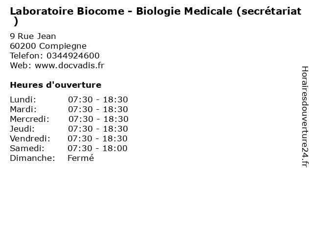 1 BIOGROUP BIOCOME- Laboratoire Guynemer (Distance: 8,15 km) 3 Place Choiseul, 60200 Compiègne biocome, biogroup, dépistages, guynemer, laboratoire, laboratoire de diagnostic 2 Laboratoire Biocome (Distance: 8,19 km) 12 Rue Jean Legendre, 60200 Compiègne biocome, bureau, consultation, dr, laboratoire, maladie, med, médecin, médecine, pratique, thérapie, traitement 3 Laboratoire Biocome (Distance: 8,45 km) 11 Rue De L'écu, 60200 Compiègne biocome, bureau, consultation, dr, laboratoire, maladie, med, médecin, médecine, pratique, thérapie, traitement 4 BIOGROUP BIOCOME - Laboratoire de la gare (Distance: 8,60 km) 211 Rue Molière, 60280 Margny les Compiègne biocome, biogroup, de, dépistages, gare, la, laboratoire, laboratoire de diagnostic 5 BIOGROUP BIOCOME - Laboratoire St Côme (Distance: 9,02 km) 9 Rue Jean Jacques Bernard, 60200 Compiègne biocome, biogroup, côme, dépistages, laboratoire, laboratoire de diagnostic, st 6 Laboratoire Biocome (Distance: 9,06 km) - Square du puy du Roy, 60200 Compiègne biocome, bureau, consultation, dr, laboratoire, maladie, med, médecin, médecine, pratique, thérapie, traitement |