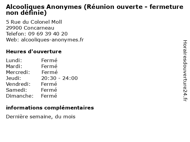 Termes de recherche pour Alcooliques Anonymes (Réunion ouverte - fermeture non définie):reunion, non, fermeture, ouverte, alcooliques, anonymes, définie |