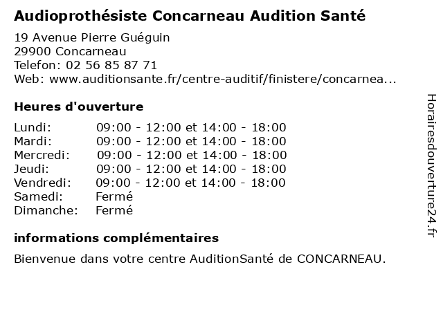 2 Audition Concarneau (Distance: 0,16 km) 13 Quai Carnot, 29900 Concarneau appareil, audioprothésiste, auditif, audition, centre, concarneau, test 3 Audition Mutualiste (Distance: 1,97 km) - Rue Joseph Bigot, 29900 Concarneau accessoires, aides auditives, audioprothésiste, audition, mutualiste, santé 6 Écouter Voir Audition QUIMPER KERNENEZ (Distance: 18,03 km) 2 Allée de Kernenez, 29000 Quimper audition, kernenez, quimper, voir, écouter |