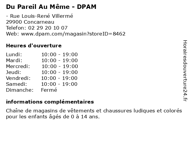 1 Du Pareil au Même (Distance: 18,68 km) 44 Rue Kéréon, 29000 Quimper au, boutiques, du, mode, même, pareil, vêtements 2 Dpam (Distance: 18,68 km) 44 Rue Kereon, 29105 Quimper affaires, boutique, dpam, produit, service, vêtements 3 Dpam (Distance: 24,36 km) S.n Cc Intermarche Za - Kervidanou 3, 29300 Mellac affaires, boutique, dpam, produit, service, vêtements 4 Du Pareil Au Même - DPAM (Distance: 24,65 km) - Za Quimperlé, 29300 Mellac au, dpam, du, même, pareil, vêtements 5 Du Pareil Au Même - DPAM (Distance: 36,48 km) 2 Grand Rue, 29150 Chateaulin au, dpam, du, même, pareil, vêtements 6 Du Pareil au Même (Distance: 43,88 km) 1 Rue de l'Assemblée nationale, 56100 Lorient au, du, enfant, magasins, même, pareil, vêtements |