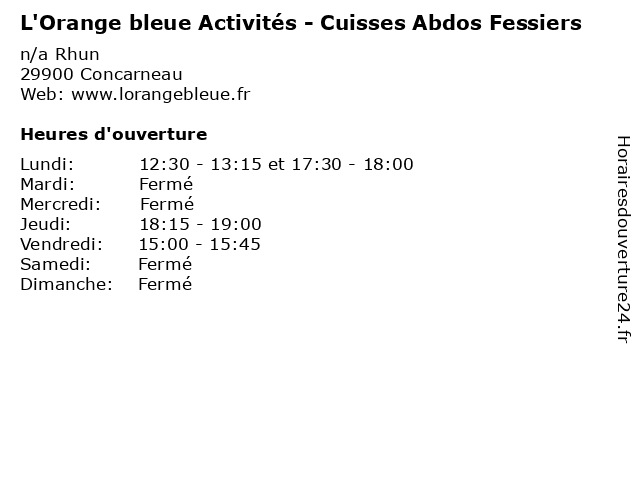 1 L'Orange bleue - Horaires d'ouverture adhérents (Distance: 0,00 km) n/a Rhun, 29900 Concarneau adhérents, bleue, d'ouverture, exercise, fitness, health, horaires, l'orange, outdoor, physical activities, sports 2 L'Orange bleue Activités - Yako training (Distance: 0,00 km) n/a Rhun, 29900 Concarneau activités, bleue, exercise, fitness, health, l'orange, outdoor, physical activities, sports, training, yako 3 L'Orange bleue Activités - Yako detente (Distance: 0,00 km) n/a Rhun, 29900 Concarneau activités, bleue, detente, exercise, fitness, health, l'orange, outdoor, physical activities, sports, yako 4 L'Orange bleue Activités - Step Deb. (Distance: 0,00 km) n/a Rhun, 29900 Concarneau activités, bleue, deb., exercise, fitness, health, l'orange, outdoor, physical activities, sports, step 5 L'Orange bleue Activités - Abdos Fessiers (Distance: 0,00 km) n/a Rhun, 29900 Concarneau abdos, activités, bleue, exercise, fessiers, fitness, health, l'orange, outdoor, physical activities, sports 6 L'Orange bleue Activités - Yako integral (Distance: 0,00 km) n/a Rhun, 29900 Concarneau activités, bleue, exercise, fitness, health, integral, l'orange, outdoor, physical activities, sports, yako |