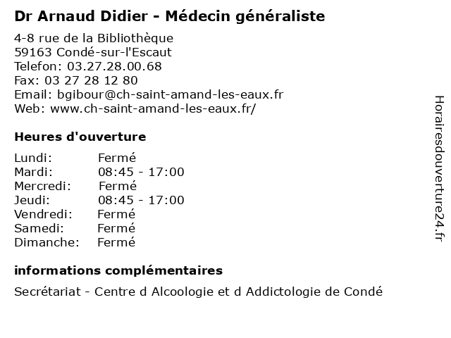 1 Dr Arnaud Didier - Médecin généraliste (Distance: 11,09 km) 19 rue des anciens d'A.F.N., 59230 Saint-Amand-les-Eaux arnaud, consultation, didier, docteur, dr, généraliste, med, médecin, médecine, traitement 2 Cattelain Didier (Distance: 5,22 km) 664 Rue Jean Jaures, 59860 Bruay Sur L Escaut boucheries, cattelain, didier, poissonneries 3 Dr Arnaud Demain - Médecin généraliste (Distance: 6,56 km) 392 Rue Jean Jaurès, 59860 Bruay-sur-l'Escaut arnaud, consultation, demain, docteur, dr, dr., générale, généraliste, libre, médecin, médecine, santé 4 Arnaud Delcarte - Ostéopathe (Distance: 8,97 km) 215 Rue Jean jaures, 59880 Saint-Saulve arnaud, delcarte, ostéo, ostéopathe, ostéopathes, soins 5 Dr Arnaud Mulliez - Chirurgien orthopédiste et traumatologue (Distance: 9,12 km) 48 bis Rue Henri Barbusse, 59880 Saint-Saulve arnaud, chirurgie, chirurgien, dr, et, general, mulliez, orthopédiste, soins, traumatologue 6 Dr Arnaud Le Roy - Médecin généraliste (Distance: 9,41 km) 20 Place du 11 Novembre, 59192 Beuvrages arnaud, docteur, dr, generaliste, généraliste, le, medical, médecin, roy, soin |
