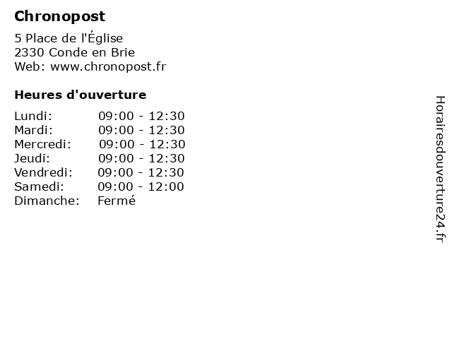 1 Chronopost (Distance: 6,07 km) 2 Rue du Calvaire, 02650 Crezancy chronopost, expédition, livraison, services 2 Chronopost (Distance: 9,54 km) 17 Rue des Forges, 02850 Jaulgonne chronopost, expédition, livraison, services 3 Chronopost (Distance: 9,75 km) 9 Rue Carnot, 51700 Dormans chronopost, expédition, livraison, services 4 Chronopost (Distance: 10,27 km) 14 Rue Du Docteur Moret, 51700 Dormans chronopost, expédition, livraison, services 5 Chronopost (Distance: 10,84 km) 4 Nervo, 02400 Etampes sur Marne chronopost, expédition, livraison, services 6 Chronopost (Distance: 10,87 km) 15 Place de la Mairie, 02400 Brasles chronopost, expédition, livraison, services  |