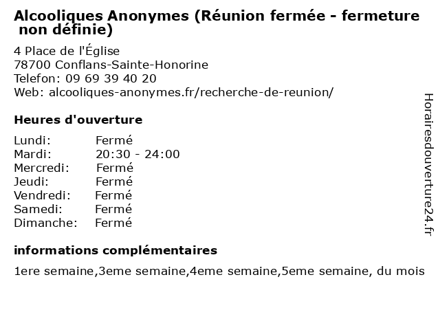 Termes de recherche pour Alcooliques Anonymes (Réunion fermée - fermeture non définie):reunion, non, fermeture, alcooliques, anonymes, définie, fermée |