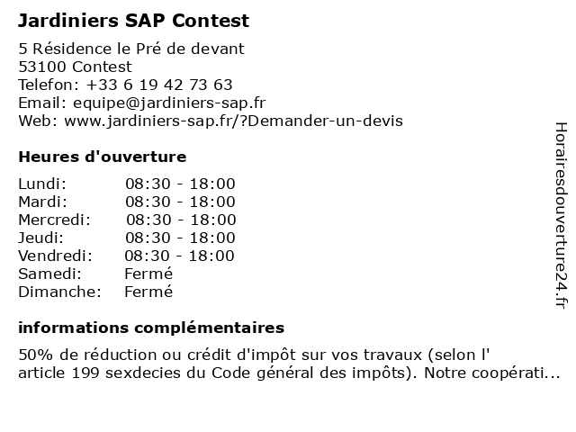 1 Jardiniers SAP Contest (Distance: 0,00 km) 5 Résidence le Pré de devant, 53100 Contest contest, jardiniers, sap 6 Jardiniers SAP Le Bourgneuf La Foret (Distance: 26,11 km) 4 Rue du Doué, 53410 Le Bourgneuf-la-Forêt bourgneuf, foret, jardiniers, la, le, sap |
