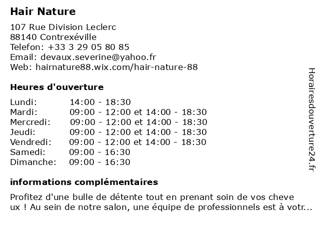| Mercredi | 09:00-12:00 et 14:00-18:30 |