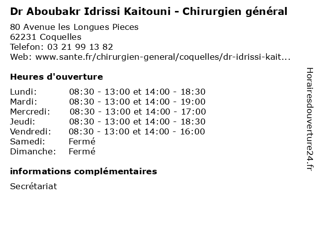 | Jeudi | 08:30-13:00 et 14:00-18:30 |