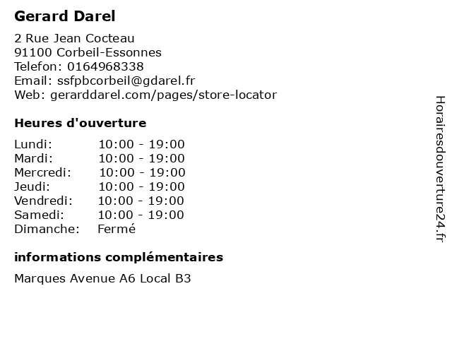 1 Gerard Darel (Distance: 2,82 km) 2 Boulevard De L'Europe, 91002 Evry accessoires, chaussures, darel, femme, gerard, homme, mode, pantalons 2 Gerard Darel (Distance: 7,45 km) 3 Allee du Préambule, 77127 Lieusaint accessoires, boutique, darel, gerard, mode, prêt à porter, sacs, vêtements 3 Gerard Darel (Distance: 19,61 km) 36 rue du moulin bateau, 94380 Bonneuil Sur Marne accessoires, boutique, darel, gerard, maroquineries, mode, prêt à porter, sacs 4 Dr Laurence Gerard - Médecin interniste (Distance: 1,26 km) 40 avenue Serge Dassault, 91106 Corbeil-Essonnes ch, cicatrisation, corbeil, dr, essonnes, francilien, gerard, infection, interniste, laurence, lésion, médecin, plaie, sud 6 Conflant Philippe Gerard Jean (Distance: 1,87 km) 2 Rue Gustave Eiffel, 91100 Corbeil Essonnes conflant, gerard, jean, philippe, restaurants |
