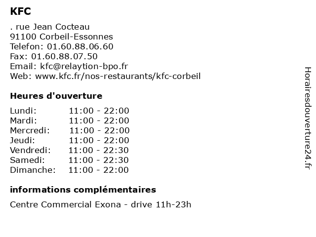 1 KFC (Distance: 11,54 km) . Route Départementale 306, 77240 Cesson boissons, burger, fastfood, frites, kfc, restaurant 3 KFC Drive (Distance: 0,00 km) . rue Jean Cocteau, 91100 Corbeil Essonnes boissons, burger, drive, fastfood, frites, kfc, restaurant 5 KFC Drive (Distance: 2,36 km) . Lieu-dit Plaine des Brateaux, 91100 Villabé boissons, burger, drive, fastfood, frites, kfc, restaurant 6 KFC Drive (Distance: 11,54 km) . route départementale 306, 77240 Cesson boissons, burger, drive, fastfood, frites, kfc, restaurant |