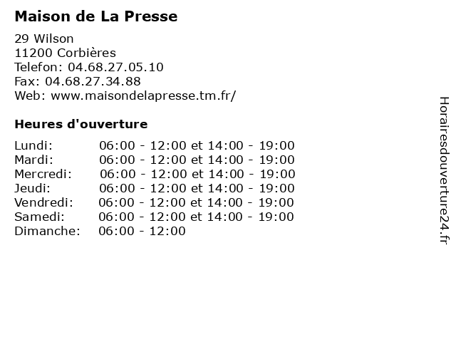 | Samedi | 06:00-12:00 et 14:00-19:00 |