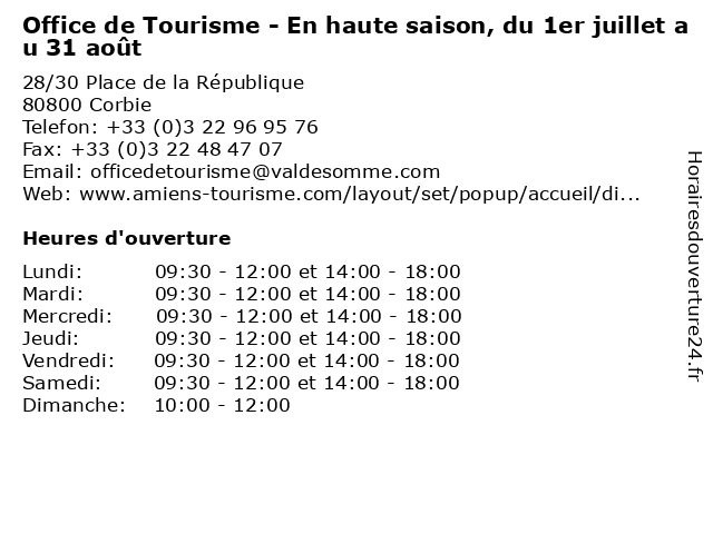 1 Office de Tourisme - En basse saison, du 1er octobre au 31 mars (Distance: 0,00 km) 28/30 Place de la République, 80800 Corbie 1er, 31, au, basse, de, du, en, horaires des musées, mars, octobre, office, restaurants, saison, tourisme, transports 2 Office de Tourisme - En moyenne saison, du 1er avril au 30 juin et du 1er au 30 septembre (Distance: 0,00 km) 28/30 Place de la République, 80800 Corbie 1er, 30, au, avril, de, du, en, et, horaires des musées, juin, moyenne, office, restaurants, saison, septembre, tourisme, transports 3 Dr Frédéric Cressent - Spécialiste en médecine physique et de réadaptation (Distance: 0,58 km) 33 Rue Gambetta, 80800 Corbie cressent, de, dr, en, et, frédéric, médecine, médecins, médicaments, physique, réadaptation, santé, secrétariat, spécialiste 4 Dr Valérie Leclercq - Spécialiste en médecine physique et de réadaptation (Distance: 0,58 km) 33 Rue Gambetta, 80800 Corbie de, dr, en, et, leclercq, médecine, médecins, médicaments, physique, réadaptation, santé, secrétariat, spécialiste, valérie 6 Agence Grand Nord - Conseil en Communication (Distance: 15,06 km) 53 Rue de l'Amiral Courbet, 80000 Amiens agence, communication, conseil, design, en, grand, informatique, nord, solutions, web |