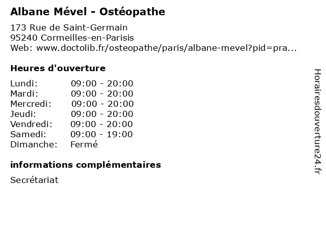 1 Albane Mével - Ostéopathe (Distance: 15,43 km) 8 Rue Mayet, 75006 Paris albane, mével, ostéo, ostéopathe, ostéopathes, soins 2 Dr Albane Lenoir - Médecin généraliste (Distance: 8,34 km) 8 Rue Maurice Berteaux, 78260 Achères albane, docteur, dr, généraliste, lenoir, médecin 3 Dr Albane Brodin-Sartorius - Néphrologue (Distance: 9,66 km) 40 Rue Worth, 92150 Suresnes albane, brodin, dr, médecins, médicaments, neurologue, néphrologue, santé, sartorius, secrétariat, spécialiste 4 Dr Albane Lenoir - Médecin généraliste - secrétariat (Distance: 12,22 km) 84 Avenue des Bruzacques, 95280 Jouy-le-Moutier albane, consultation, docteur, dr, généraliste, lenoir, med, médecin, médecine, publiques, secrétariat, traitement 5 Camille Albane (Distance: 14,03 km) 50 Rue de la Chaussée d’Antin, 75009 Paris albane, beauté, camille, cheveux, coiffeur, coiffure, coupe, esthétique, salon, visagiste 6 Camille Albane (Distance: 14,05 km) 18 Rue Saint Cloud, 92410 Ville Davray albane, camille, hair beauty, hairdresser, hand care, makeup, salon |