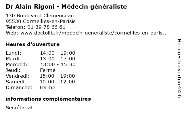 1 Dr Alain Fedorowsky - Cardiologue (Distance: 1,13 km) 15 Avenue de la Libération, 95240 Cormeilles-en-Parisis alain, cardio, cardiologie, cardiologue, coeur, dr, fedorowsky 2 Dr Alain Onkani - Cardiologue (Distance: 2,05 km) - Rue du Plessis Bouchard, 95370 Montigny-lès-Cormeilles alain, cardio, cardiologie, cardiologue, coeur, dr, onkani 3 Dr.Alain Delestrain- Cardiologie (Distance: 4,47 km) 102 avenue Maurice Berthaux, 78500 Sartrouville cardiologie, consultation, delestrain, docteur, dr.alain, santé 4 Dr Jean-Alain Cacault - Gynécologue médical - secrétariat (Distance: 5,72 km) 21 Rue Camille Pelletan, 78800 Houilles alain, cacault, consultation, docteur, dr, gynécologue, jean, med, médecin, médecine, médical, secrétariat, traitement 5 Dr Alain Weissman - Gastro-entérologue et hépatologue - secrétariat (Distance: 5,79 km) 9 Avenue Louis Armand, 95120 Ermont alain, consultation, docteur, dr, entérologue, et, gastro, hépatologue, med, médecin, médecine, secrétariat, traitement, weissman 6 Dr Alain Amsellem - Chirurgien-dentiste (Distance: 6,44 km) 42 Rue Gambetta, 78800 Houilles alain, amsellem, chirurgien, dentaire, dentiste, dr, implantologie, parodontologie |