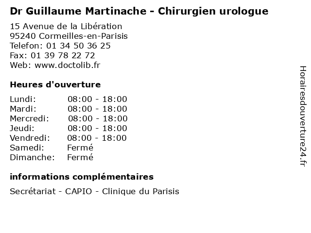 1 Dr Guillaume Martinache - Chirurgien urologue (Distance: 4,87 km) 9 Avenue Louis Armand, 95120 Ermont chirurgien, consultation, docteur, dr, guillaume, martinache, med, médecin, médecine, secrétariat, traitement, urologue 2 Dr Guillaume Martinache - Chirurgien urologue (Distance: 17,30 km) 3 Chemin des Trois Sources, 95290 L'Isle-Adam chirurgien, consultation, docteur, dr, guillaume, martinache, med, médecin, médecine, secrétariat, traitement, urologue 3 Dr Pierre Robert Martinache - Chirurgien urologue (Distance: 0,00 km) 15 Avenue de la Libération, 95240 Cormeilles-en-Parisis centre, chirurgien, clinique, dr, du, general, martinache, parisis, pierre, privée, robert, sante, soins, urologue 4 Dr Laurent Thomas - Chirurgien urologue (Distance: 0,00 km) 15 Avenue de la Libération, 95240 Cormeilles-en-Parisis centre, chirurgien, clinique, dr, du, general, laurent, parisis, privée, sante, soins, thomas, urologue 5 Salle Polyvalente Guillaume Apollinaire (Distance: 1,03 km) 37 Square Guillaume Apollinaire, 95240 Cormeilles-en-Parisis apollinaire, arène, cormeilles, guillaume, gymnase, polyvalente, salle, sport 6 École Primaire Publique Les Champs Guillaume (Distance: 1,22 km) - Rue des Champs Guillaume, 95240 Cormeilles-en-Parisis champs, cours, education, guillaume, les, primaire, publique, services, École, école |