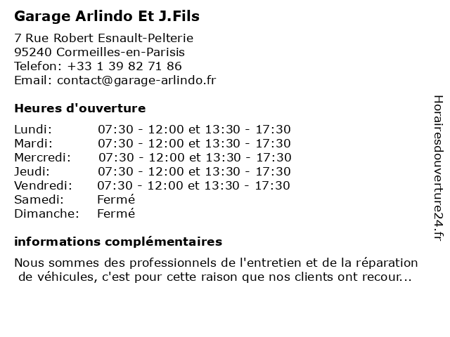 1 Garage Arlindo J Fils - Motrio (Distance: 0,00 km) 7 Rue Robert Esnault-Pelterie, 95240 Cormeilles-en-Parisis arlindo, devis en ligne cormeilles-en-parisis, dépannage auto cormeilles-en-parisis, fils, garage, garage automobile 95, garage automobile cormeilles-en-parisis, garage automobile à proximité, garage cormeilles-en-parisis, garage motrio cormeilles-en-parisis, garage multimarque, motrio, pneus motrio 2 Parenton et Fils Plomberie (Distance: 5,76 km) 11 Rue auguste bartholdi, 78420 Carrieres sur seine carrieres sur seine, et, fils, parenton, plomberie 3 Petits-fils (Distance: 8,64 km) 19 bis rue de la Tourelle, 95170 Deuil-la Barre accompagnements, aide aux repas, fils, petits 4 Buyens & Fils Chauffagiste (Distance: 8,66 km) 6 Rue bernard palissy, 92800 Puteaux buyens, chauffagiste, fils, puteaux 5 Burger & Fils (Distance: 12,51 km) 9 rue du Commandant Rivière, 75008 Paris burger, de la nourriture, des boissons, dîners, fastfood, fils, restaurant 6 Franck & Fils (Distance: 12,53 km) 80 Rue Passy, 75016 Paris bags, business, clothing, fils, franck, shoes, shopping, stores |