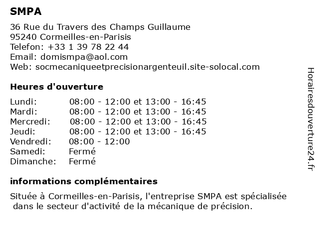 Située à Cormeilles-en-Parisis, l'entreprise SMPA est spécialisée dans le secteur d'activité de la mécanique de précision.