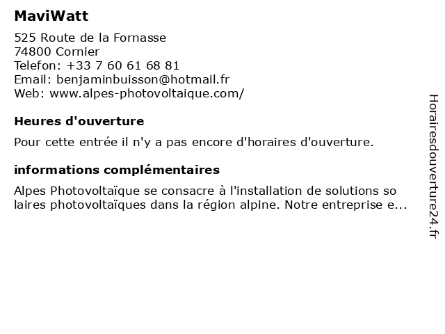 1 MaviWatt (Distance: 13,13 km)59 Impasse du Clos des Sauges, 74570 Fillière maviwatt