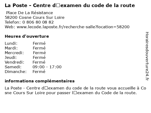 1 La Poste - Centre d’examen du code de la route (Distance: 10,65 km) , 18300 Sancerre centre, centre d'évaluation scolaire, code, de, du, d’examen, la, poste, route, école technique 2 ObjectifCode - Centre d'examen du code de la route Cosne-Cours-sur-Loire (Distance: 1,34 km) Avenue Du 85, 58200 Cosne-Cours-sur-Loire centre, code, cosne, cours, d'examen, de, du, la, loire, objectifcode, route, sur 3 La Poste - Centre d’examen du code de la route (Distance: 39,89 km) Rue Denis Papin, 45500 Gien centre, centre d'évaluation scolaire, code, de, du, d’examen, la, poste, route, école technique 4 La Poste - Centre d’examen du code de la route (Distance: 45,41 km) 16 Place Des Frères Genêt, 89130 Toucy centre, centre d'évaluation scolaire, code, de, du, d’examen, la, poste, route, école technique 5 La Poste - Centre d’examen du code de la route (Distance: 47,43 km) 10 Place De La République, 58640 Varennes-Vauzelles centre, centre d'évaluation scolaire, code, de, du, d’examen, la, poste, route, école technique 6 La Poste - Centre d’examen du code de la route (Distance: 50,10 km) 44 Rue De La Raie, 58000 Nevers centre, centre d'évaluation scolaire, code, de, du, d’examen, la, poste, route, école technique |