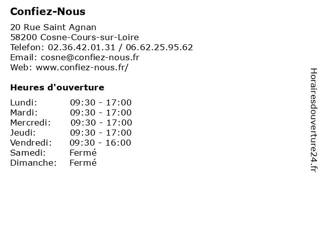 1 Confiez-Nous (Distance: 4,06 km) 17 Place des Tilleuls, 18240 Boulleret agence, aides, confiez, nous, personnes, services 2 Confiez-Nous (Distance: 37,58 km) 18 avenue maréchal Leclerc, 45500 Gien agence, aide, confiez, domicile, nous, personne, santé, services 3 Confiez-Nous (Distance: 50,43 km) 15 rue Aristide Briand, 45290 Nogent sur Vernisson agence, aide, confiez, domicile, nous, personne, santé, services 5 Croix Rouge Francaise (Distance: 0,72 km) 7 Rue Bernot, 58200 Cosne Cours Sur Loire action itinérante d'aides sociales et matérielles, aides financières, croix, francaise, postes de secours, rouge, urgence et autres opérations 6 Point d'information local dédié aux personnes âgées (Distance: 1,20 km) 9 Mail Saint-Laurent, 58200 Cosne-Cours-sur-Loire administration, aux, cosne, cours, d'information, dédié, local, loire, organismes, personnes, point, publics, services, sur, âgées |
