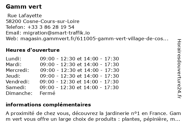 1 GAMM VERT (Distance: 1,10 km) ZC Champs De La Dispute Rue Général Binot, 58200 Cosne-Cours-sur-Loire animalerie, gamm, jardin, jardinerie, mobilier de jardin, plantes, pépinière, vert 2 GAMM VERT (Distance: 7,93 km) Rue de la Gare du Canal, 18300 Saint-Satur animalerie, gamm, jardin, jardinerie, mobilier de jardin, plantes, pépinière, vert 4 Gamm Vert (Distance: 13,80 km) . Place du Champ de Foire, 58310 Saint-Amand-en-Puisaye animalerie, animaux, gamm, horticulteur, jardin, jardinerie, vert 5 GAMM VERT (Distance: 15,02 km) Rue de la Bertine, 58220 Donzy animalerie, gamm, jardin, jardinerie, pepinière, plantes, vert 6 GAMM VERT (Distance: 18,59 km) 17 Avenue de la Gare, 58310 Saint-Amand-en-Puisaye animalerie, gamm, jardin, jardinerie, mobilier de jardin, outillage, plantes, pépinière, vert |