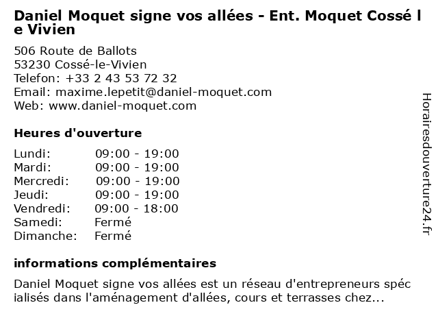 2 Paillard Et Fils Ent De Peinture (Distance: 18,06 km) 60 Rue des Alignés, 53000 Laval de, ent, et, fils, paillard, peinture 3 ERA Laval Immobilier Daniel Rizet (Distance: 18,82 km) 33 Rue du Pont de Mayenne, 53000 Laval daniel, era, immobilier, laval, rizet 4 Daniel Moquet Signe Vos Allées - Ent. Fouassier (Distance: 20,64 km) 12 Rue des Martinières, 53960 Bonchamp-lès-Laval allée, allées, aménagement extérieur, aménagement plage de piscine, aménagement terrasse, béton, cour, cour drainante, dallage, daniel, daniel moquet allées, enrobé, ent., entrée de garage, entrée de maison, fouassier, gazon synthétique, gravillon, moquet, pavage, paysagiste, revêtement, signe, terrasse, tour de piscine, vos 6 Martin Agencement (Distance: 23,21 km) 6 Rue de la Garenne, 35130 La Guerche de Bretagne agencement, extérieur, intérieur, martin |