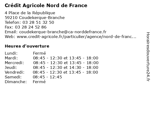 1 Crédit Agricole Nord de France (Distance: 1,76 km) 5-7 Sainte-Barbe, 59140 Dunkerque agence, agricole, assurance, bancaire, banque, crédit, de, france, nord 2 Crédit Agricole Nord de France (Distance: 3,41 km) 15 Place Turenne, 59240 Malo-les-Bains agence, agricole, assurance, bancaire, banque, crédit, de, france, nord 3 Crédit Agricole Nord de France (Distance: 4,31 km) 11 Rue de la Mairie, 59229 Teteghem agence, agricole, assurance, bancaire, banque, crédit, de, france, nord 4 Crédit Agricole Nord de France (Distance: 6,20 km) 77 Avenue de l'Ancien Village, 59760 Grande-Synthe agence, agricole, assurance, bancaire, banque, crédit, de, france, nord 5 Crédit Agricole Nord de France (Distance: 6,68 km) - rue Nationale, 59380 Bergues agence, agricole, assurance, bancaire, banque, crédit, de, france, nord 6 Crédit Agricole Nord de France (Distance: 11,20 km) 30 Rue Roger Salengro, 59123 Bray-Dunes agricole, assurances, bancaire, banque, crédit, de, france, gascogne, mutuel, nord, pyrénées, services |