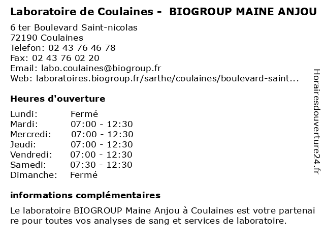 Termes de recherche pour Laboratoire de Coulaines - BIOGROUP MAINE ANJOU:de, laboratoire, anjou, maine, coulaines, biogroup, dépistages, laboratoire de diagnostic |