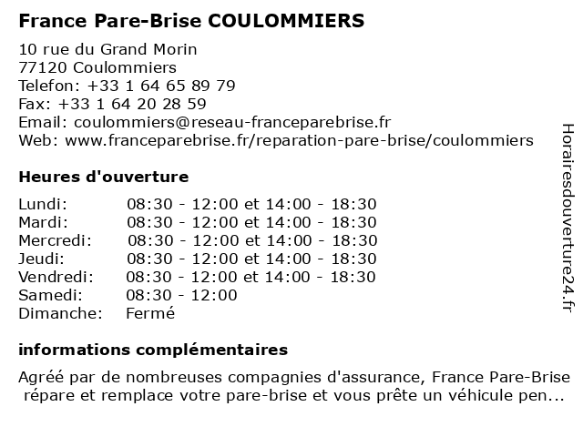 | 1 France Pare Brise (Distance: 0,02 km) 10 Rue du Grand Morin, 77120 Coulommiers bris de glace, brise, france, pare, services 2 Mondial Pare-Brise - Point Relais (Distance: 0,43 km) 28 Rue de l'Orgeval, 77120 Coulommiers brise, mondial, pare, point, relais 3 Mondial Pare-Brise (Distance: 1,55 km) 6, rue Delsol, 77120 Coulommiers brise, centers, machinery, mondial, optical headlight wipers, pare, rear window, repair, services, side, technical, vehicle, windows, windshield 4 Autoprimo - Garage ID Pare-Brise (Distance: 13,70 km) 3 chemin du Jeu d'Arc, 77640 Signy-Signets atelier, automobile, autoprimo, brise, carrosserie, concession, entretien, garage, id, pare, réparation 5 Mondial Pare-Brise (Distance: 15,57 km) 38 Avenue Franklin Roosevelt, 77260 La Ferté-sous-Jouarre brise, mondial, pare 6 Berthillon (Distance: 54,24 km) 29-31 rue St Louis en l'Ile, 75004 Paris berthillon, glace & yaourt glacé, restaurant français, salon de thé |