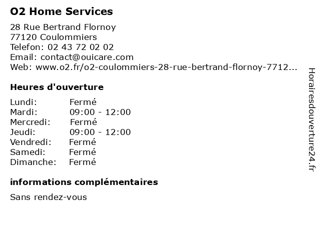 1 O2 Home Services (Distance: 0,00 km) 28 Rue Bertrand Flornoy, 77120 Coulommiers domicile, home, o2, services 2 O2 Home Services (Distance: 10,28 km) 1 rue de la Fontaine, 30360 Saint-Jean aide aux seniors, garde d'enfants, handicap, home, incapacite temporaire, jardinage, menage repassage, o2, services 3 O2 Home Services (Distance: 18,24 km) 67 Avenue de Verdun, 77470 Trilport aide aux seniors, garde d'enfants, handicap, home, incapacite temporaire, jardinage, menage repassage, o2, services 4 O2 Jardinage (Distance: 18,38 km) 17 Rue Cyprien Borgnon, 77860 Couilly-Pont-aux-Dames domicile, jardinage, o2, services 5 Home Assistance (Distance: 19,64 km) 9 Avenue du Marquis de Trésigny, 77610 Fontenay-Trésigny assistance, home 6 O2 Home Services (Distance: 49,90 km) 7 rue de Toul, 75012 Paris aide aux seniors, garde d'enfants, handicap, home, incapacite temporaire, jardinage, menage repassage, o2, services |