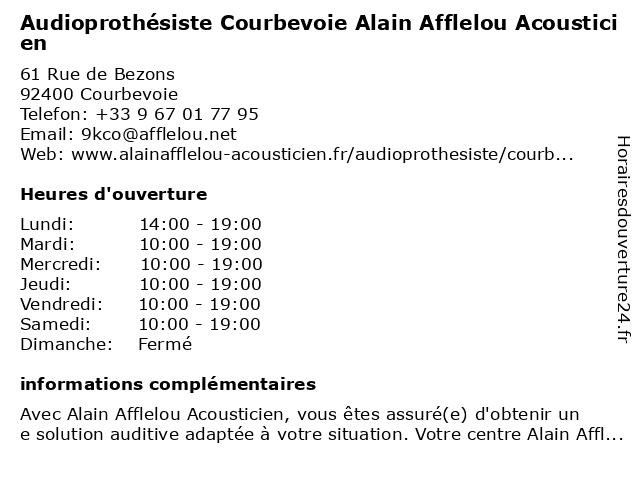 1 Opticien Courbevoie | Alain Afflelou (Distance: 0,00 km) 61 Rue De Bezons, 92400 Courbevoie afflelou, alain, courbevoie, magasin de lunettes de soleil, magasin d’accessoires de mode, opticien, optométrie 2 Amplifon Audioprothésiste Courbevoie Gare (Distance: 0,04 km) 53 Rue De Bezons, 92400 Courbevoie amplifon, audiologie, audioprothésiste, courbevoie, gare, nez, oreilles & gorge, oto-rhino-laryngologie (orl) 3 Audika - Audioprothésiste Courbevoie (Distance: 0,05 km) 71 Rue de Bezons, 92400 Courbevoie appareil auditif, audika, audiologiste, audioprothésiste, centre auditif, courbevoie, spécialiste audition 4 Dr Alain Flak - Chirurgien-dentiste (Distance: 0,30 km) 20 ter Rue de Bezons, 92400 Courbevoie alain, chirurgien, consultation, dentiste, docteur, dr, flak, med, médecin, médecine, traitement 5 Dr Alain Berthe ORL - Chirurgien de la face et du cou (Distance: 0,90 km) 53 Rue Victor Hugo, 92400 Courbevoie alain, berthe, chirurgien, consultation, cou, de, docteur, dr, du, et, face, la, med, médecin, médecine, orl, secrétariat, traitement 6 Dr. Alain Postel - Dentiste (Distance: 0,95 km) 39 Cour Michelet, 92800 Puteaux alain, dentiste, docteur, dr., medecins, postel, sante |