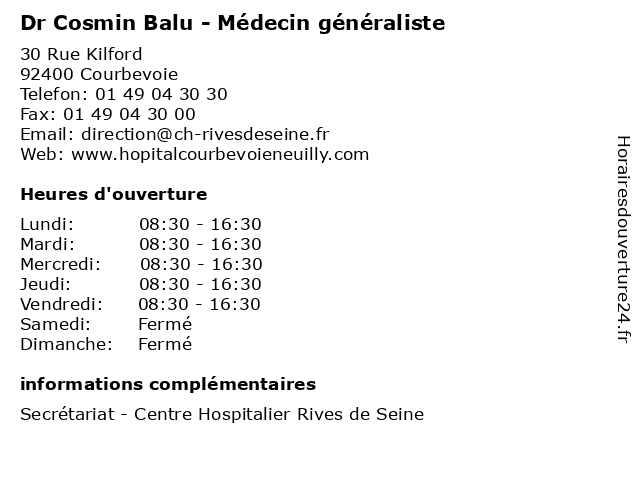 1 Dr Cosmin-Gabriel Cristea - Gastro-entérologue et hépatologue (Distance: 9,88 km) 25 Boulevard Saint-Jacques, 75014 Paris consultation, cosmin, cristea, docteur, dr, entérologue, et, gabriel, gastro, hépatologue, med, médecin, traitement 2 Dr Edward Cosmin Manoiu - Chirurgien-dentiste (Distance: 23,28 km) 18 Avenue de la Gare, 93420 Villepinte chirurgien, cosmin, dentaire, dentiste, dr, edward, implantologie, manoiu, parodontologie 3 Dr Cosmin Cristea - Gastro-entérologue et hépatologue (Distance: 33,35 km) 4 Avenue de Mousseau, 91000 Évry cosmin, cristea, dr, enterelogue, entérologue, et, gastro, hepatolgue, hépatologue, soins 4 Dr Cosmin Alecu - Neurologue (Distance: 35,50 km) 40 avenue Serge Dassault, 91106 Corbeil-Essonnes alecu, cerveau, ch, corbeil, cosmin, dr, essonnes, francilien, nerf, neurologie, neurologue, sud 5 Dr Sawsan Saad - Médecin généraliste (Distance: 0,00 km) 30 Rue Kilford, 92400 Courbevoie consultation, docteur, dr, généraliste, med, médecin, saad, sawsan, traitement 6 Dr Rubben Boujnah - Médecin généraliste (Distance: 0,58 km) 32 Rue Voltaire, 92250 La Garenne-Colombes boujnah, docteur, dr, generaliste, généraliste, medical, médecin, rubben, soin |