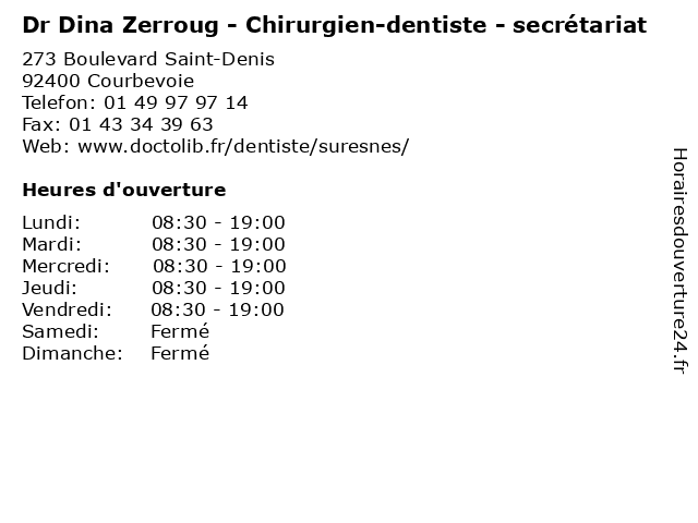 1 Dr Dina Zerroug - Chirurgien-dentiste - secrétariat (Distance: 5,02 km) 12 Place du Général Leclerc, 92150 Suresnes chirurgien, consultation, dentiste, dina, docteur, dr, med, médecin, médecine, secrétariat, traitement, zerroug 2 Dina Ohayon - Psychologue (Distance: 5,23 km) 43 Rue de la Chaussée d'Antin,, 75009 Paris cabinets, dina, médecins, ohayon, psychologue, secrétariat, thérapies 3 Dr Dina Zerroug - Chirurgien-dentiste (Distance: 6,33 km) 33 Rue du Commerce, 75015 Paris chirurgien, dentaire, dentiste, dina, dr, implantologie, parodontologie, zerroug 4 Dr Dina Ouzen-Rudnianski - Médecin généraliste (Distance: 8,44 km) 6 Allée Gustave Eiffel, 92130 Issy-les-Moulineaux dina, docteur, dr, generaliste, généraliste, medical, médecin, ouzen, rudnianski, soin 5 Maître Dina Cohen-Sabban - Avocate (Distance: 12,17 km) 3 Rue Viteau, 94160 Saint Mandé avocate, avocats, civils, cohen, dina, droits, juridiques, maître, sabban 6 |