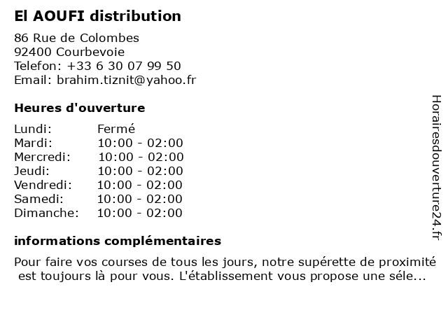 1 El Wed Wadi (Distance: 0,77 km) Aux Bains d Argan Morvilette, 28500 Saulnieres restaurants, wadi, wed 2 Courbevoie Distribution (Distance: 1,10 km) 48 Boulevard Georges Clemenceau, 92400 Courbevoie courbevoie, distribution 3 Laakel El h Et Jolivet c (Distance: 1,14 km) 20 Avenue De Charlebourg, 92250 La Garenne Colombes jolivet, laakel, restaurants 4 Audexi Expertise Comptable: Omar El Morabit (Distance: 2,03 km) 1 bis Rue Albert 1er, 92600 Asnières-sur-Seine audexi, comptabilité, comptable, el, expert-comptable, expertise, morabit, omar, service 5 Dr Mourad El Janati - Chirurgien-dentiste (Distance: 2,33 km) 19 Rue Saint-Denis, 92700 Colombes chirurgien, consultation, dentiste, docteur, dr, el, janati, med, mourad, médecin, médecine, secrétariat, traitement 6 Inès El Amrani - Ostéopathe (Distance: 2,37 km) 64 Rue Saint-Denis, 92700 Colombes amrani, el, ines, inès, ostéo, ostéopathe, ostéopathes, soins |