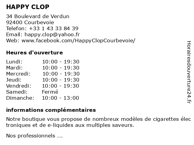 2 Happy Midi B-Bim (Distance: 1,42 km) 10 rue Paul Vaillant Couturier, 92300 Levallois Perret bim, coréen, cuisine, happy, midi, restaurant, restauration, spécialités 3 HAPPY (Distance: 1,53 km) 2 bis Rue du château, 92200 Neuilly Sur Seine boutique, fleuriste, fleurs, happy 4 Crèche People and Baby - Happy Eveil - Bois Colombes (Distance: 1,77 km) 19 Rue du Général Leclerc, 92270 Bois-Colombes and, baby, bois, colombes, crèche, crèches, eveil, garde d'enfants, happy, les services parentalité, people, projet social, projet éducatif 6 Crèche People and Baby - Happy Zou Villiers - LMB (Distance: 2,05 km) 4 Rue de Villiers, 92300 Levallois-Perret and, baby, crèche, crèches, garde d'enfants, happy, les services parentalité, lmb, people, projet social, projet éducatif, villiers, zou |