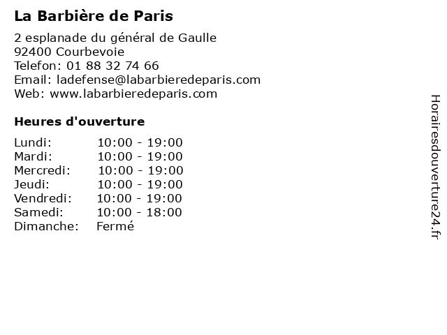 1 La Barbière de Paris (Distance: 5,87 km) 10 Place de la Concorde, 75008 Paris barbière, coiffure, de, esthétique, homme, la, paris, rasage, soin 2 La Barbière de Paris (Distance: 7,11 km) 19 rue de l’abbé Grégoire, 75006 Paris barbière, coiffure, de, esthétique, homme, la, paris, rasage, soin 3 La Barbière de Paris (Distance: 7,30 km) 14 Rue Condorcet, 75009 Paris barbière, coiffure, de, esthétique, homme, la, paris, rasage, soin 4 La Barbière de Paris (Distance: 7,75 km) 7 rue Bertin Poirée, 75001 Paris barbière, coiffure, de, esthétique, homme, la, paris, rasage, soin 5 Le Miroir au Meliá Paris La Défense - Courbevoie (Distance: 0,12 km) 2 esplanade du Général De Gaulle, 92081 Courbevoie au, boulangers, cafes, courbevoie, défense, epiceries, fromagers, la, le, meliá, miroir, paris, patisseries, restaurant 6 Bistro Romain Paris Sarl (Distance: 0,12 km) Tour Manhatan 5 a 6, 92400 Courbevoie bistro, paris, restaurants, romain |
