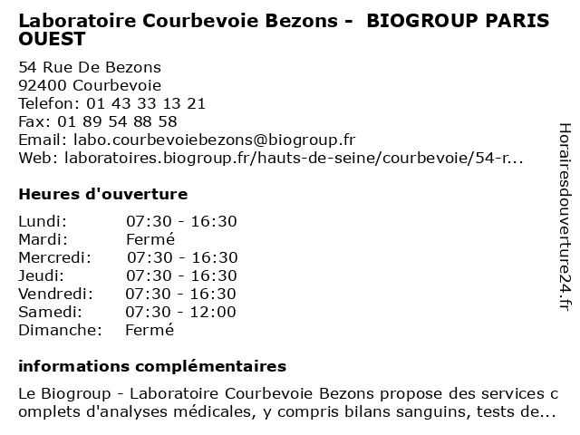 Termes de recherche pour Laboratoire Courbevoie Bezons - BIOGROUP PARIS OUEST:paris, laboratoire, courbevoie, ouest, bezons, biogroup, dépistages, laboratoire de diagnostic |