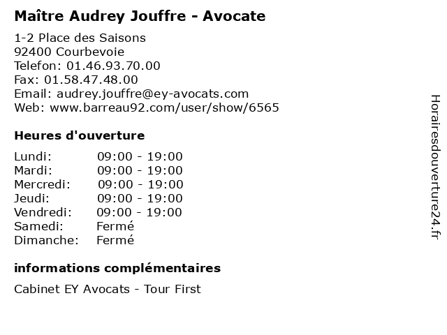 1 Maître Audrey Teurlings - Avocate (Distance: 0,00 km) 1-2 Place des Saisons, 92400 Courbevoie audrey, avocate, avocats, civils, droits, juridiques, maître, teurlings 2 Maître Audrey Viros - Avocate (Distance: 0,28 km) 4-6 Avenue d'Alsace, 92400 Courbevoie audrey, avocate, avocats, civils, droits, juridiques, maître, viros 3 Dr Audrey Rosefort - Gynécologue obstétricienne (Distance: 0,37 km) 2 Place des Reflets, 92400 Courbevoie audrey, bebe, dr, gynecologie, gynécologue, maternite, obstetrique, obstétricienne, rosefort 4 Audrey Blanc - Psychologue (Distance: 0,38 km) 4 Place des Reflets, 92400 Courbevoie audrey, blanc, folie, psychiatre, psychiatrie, psychiatrique, psychologue 5 Maître Audrey Eyraud - Avocate (Distance: 0,70 km) 20 avenue André Prothin, 92400 Courbevoie audrey, avocate, avocats, cabinet, conseils, contentieux, eyraud, juridique, justice, litiges, maître, services 6 Maître Audrey Philippe - Avocate (Distance: 0,72 km) 6 Place de la Pyramide, 92800 Puteaux audrey, avocate, avocats, civils, droits, juridiques, maître, philippe |