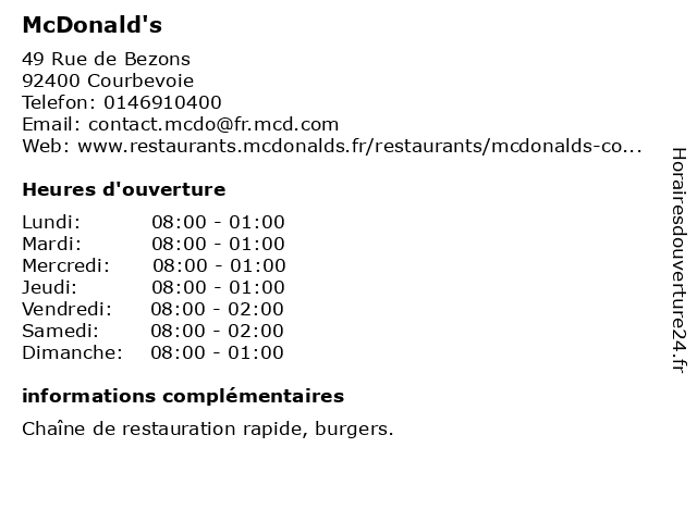 1 McDonald's (Distance: 1,75 km) 64 Boulevard Charles De Gaulle, 92000 Colombes burgers, fast, food, hamburgers, mcdonald's, rapide, restaurant, restauration 2 McDonald's (Distance: 3,05 km) 41 Rue Du Bournard, 92700 Colombes burgers, fast, food, hamburgers, mcdonald's, rapide, restaurant, restauration 3 McDonald's (Distance: 5,51 km) 46 Rue Du Château, 92500 Rueil-Malmaison burgers, fast, food, hamburgers, mcdonald's, rapide, restaurant, restauration 4 McDonald's (Distance: 6,90 km) 192 Boulevard Jean Jaurès, 92100 Boulogne-Billancourt burgers, fast, food, hamburgers, mcdonald's, rapide, restaurant, restauration 5 McDonald's (Distance: 7,63 km) 3 Rue de l'Horionne, 95110 Sannois burgers, fast, food, hamburgers, mcdonald's, rapide, restaurant, restauration 6 McDonald's (Distance: 8,39 km) - Centre Commercial Les Trois Moulins, 92130 Issy-les-Moulineaux burgers, fast, food, hamburgers, mcdonald's, rapide, restaurant, restauration |
