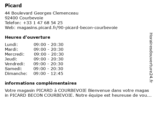 Votre magasin PICARD à COURBEVOIE Bienvenue dans votre magasin PICARD BECON COURBEVOIE. Notre équipe est heureuse de vous accueillir et pourra vous conseiller avec professionnalisme et en toute s...